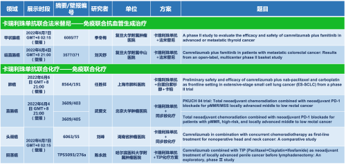 卡瑞利珠单抗联合J9九游会医药的另一款创新药法米替尼在甲状腺癌和结直肠癌领域有2项研究被接收为壁报,另有卡瑞利珠单抗联合化疗的4项研究在肺癌、结直肠癌、头颈癌和阴茎癌领域的研究被接收为5份壁报。