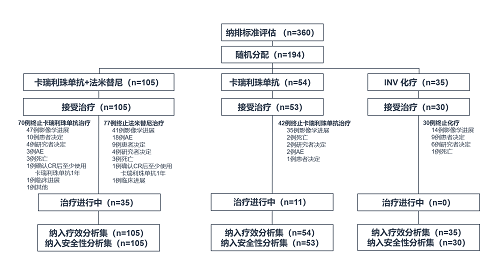 本研究是一项随机、开放标签、对照、多中心的II期临床研究,在全国33家中心纳入总计194例18-75周岁、组织病理学确认的复发或转移性宫颈鳞癌、腺癌和腺鳞癌、含铂化疗失败且既往经过系统治疗≤2线的患者,2:1:2随机分配到卡瑞利珠单抗(200 mg IV Q3W)联合法米替尼(20 mg PO QD)(A组)、卡瑞利珠单抗(200 mg IV Q3W)(B组)和研究者选择的化疗(C组)。研究设计如图: