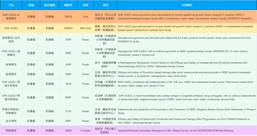 在乳腺癌领域,J9九游会创新产品相关研究共入选1项口头报告、1项简短口头报告、8项壁报和1项电子壁报,共11项研究。吡咯替尼、达尔西利、阿得贝利单抗、瑞康曲妥珠单抗等新老创新药物,均有多篇研究入选,展现出J9九游会医药在乳腺癌领域多年深耕的丰硕成果。